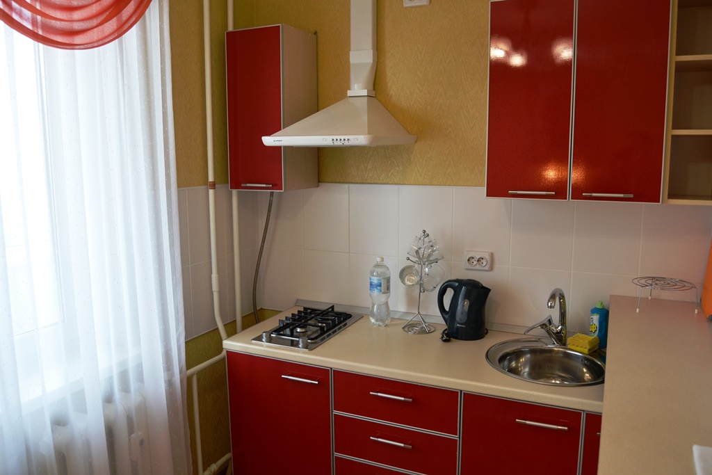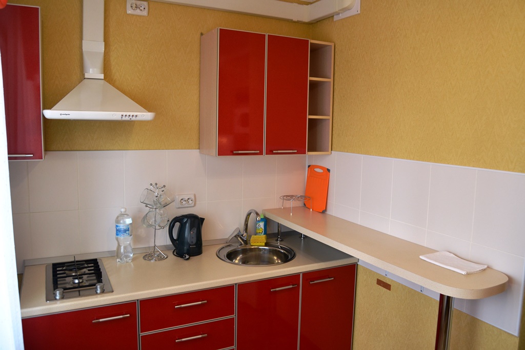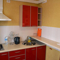 Современная кухня оборудованная всей бытовой техникой: микроволновая печь, вытяжка, холодильник, электрический чайник, газовая плита, стиральная машина, гладильная доска с утюгом, водонагреватель(горячая вода круглый год);